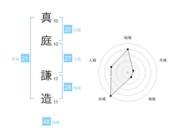真庭 謙造さんを姓名の画数から五運を鑑定