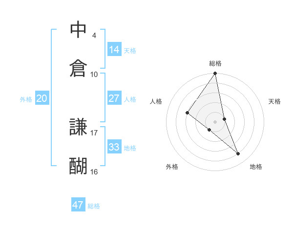 中倉 謙醐さんを姓名の画数から五運を鑑定