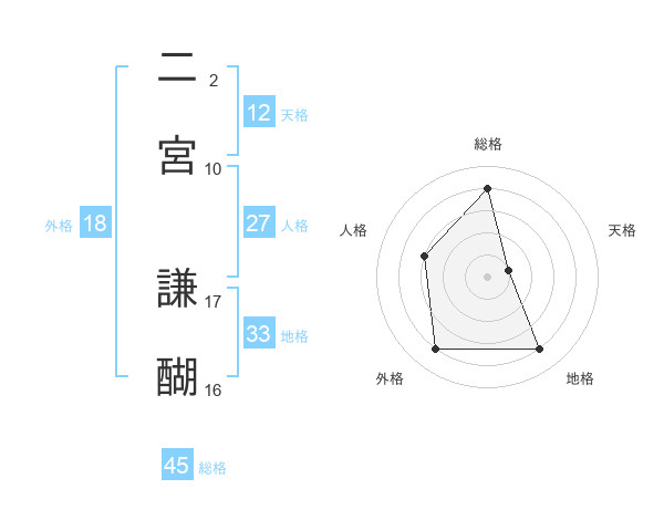 二宮 謙醐さんの総格は45画の4点!