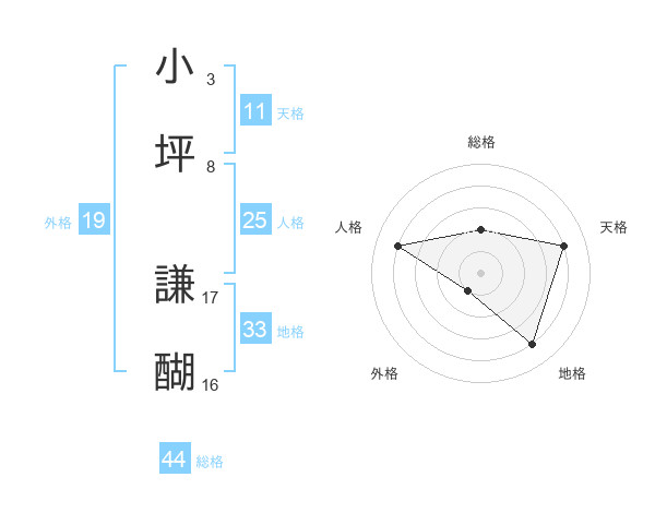 小坪 謙醐さんの総格は44画の2点!