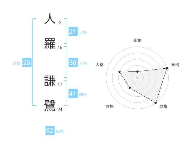 人羅 謙鷺さんの天格は21画の5点!