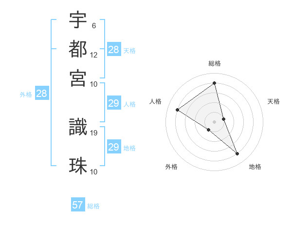 宇都宮 識珠さんの総格は57画の4点!