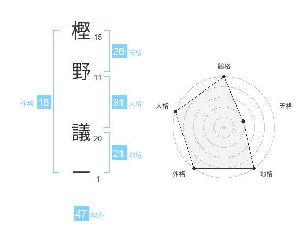 樫野 議一さんの総格は47画の5点!