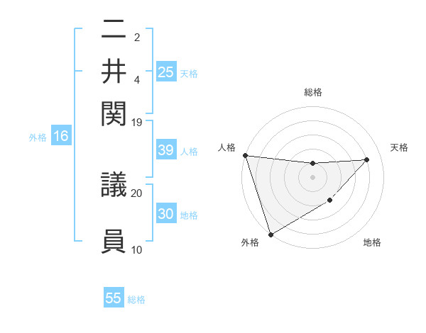 二井関 議員さんの総格は55画の1点!