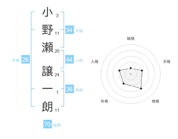 小野瀬 譲一朗さんの総格は70画の1点!