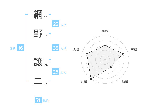 網野 譲二さんの総格は51画の3点