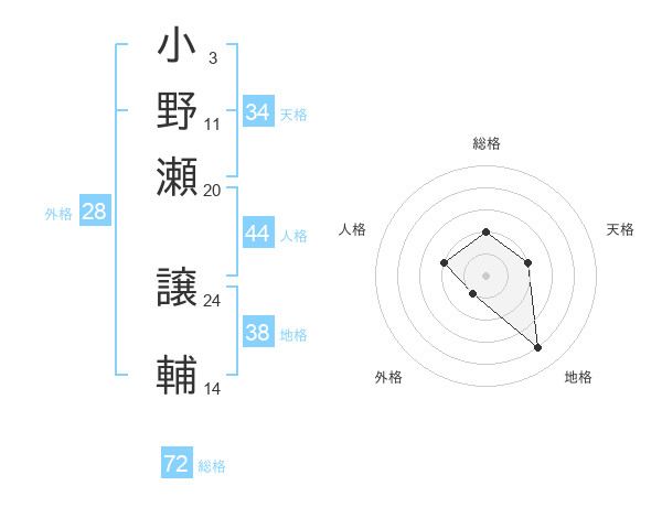 小野瀬 譲輔さんの総格は72画の2点!