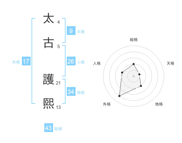 太古 護煕さんの総格は43画の2点!