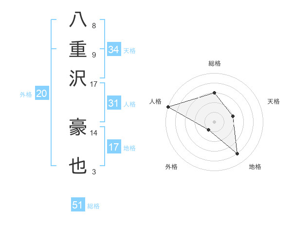 八重沢 豪也さんの総格は51画の3点!
