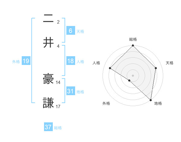 二井 豪謙さんを姓名の画数から五運を鑑定