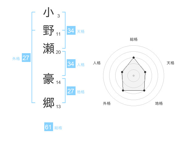 小野瀬 豪郷さんの総格は61画の3点!