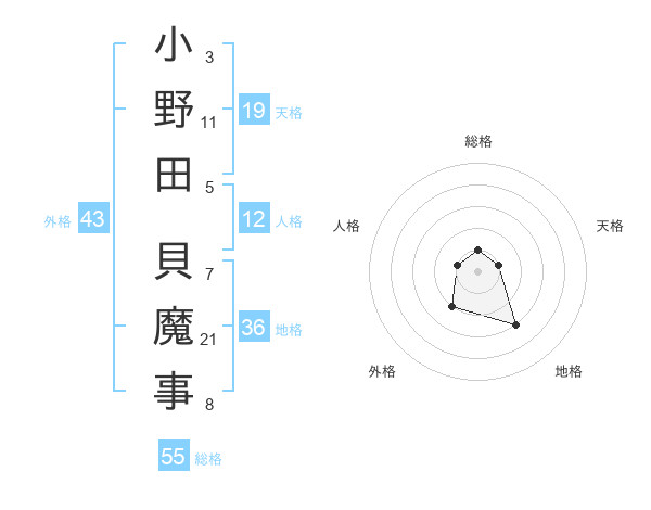 小野田 貝魔事さんを姓名の画数から五運を鑑定