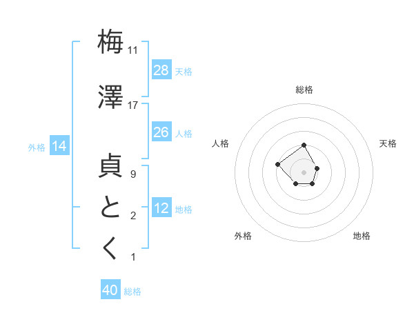 梅澤 貞とくさんを姓名の画数から五運を鑑定