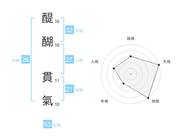 醍醐 貫氣さんの総格は53画の3点!