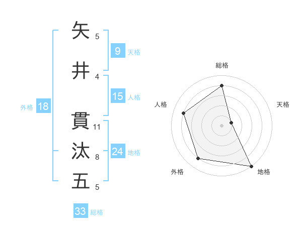 矢井 貫汰五さんの総格は33画の4点!