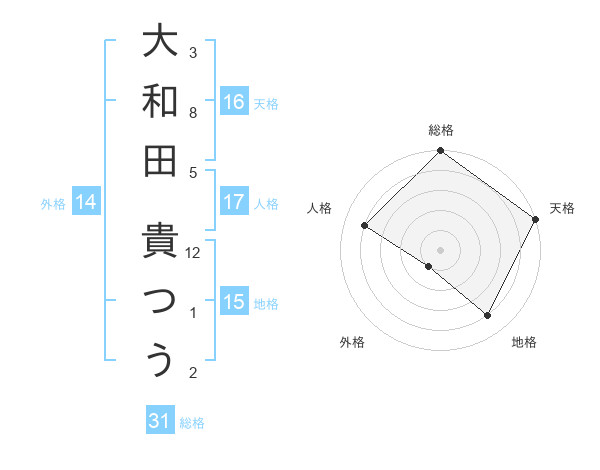 大和田 貴つうさんを姓名の画数から五運を鑑定
