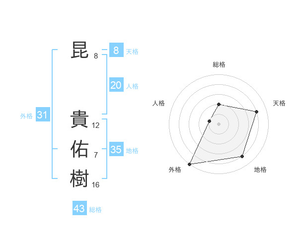 昆 貴佑樹さんを姓名の画数から五運を鑑定