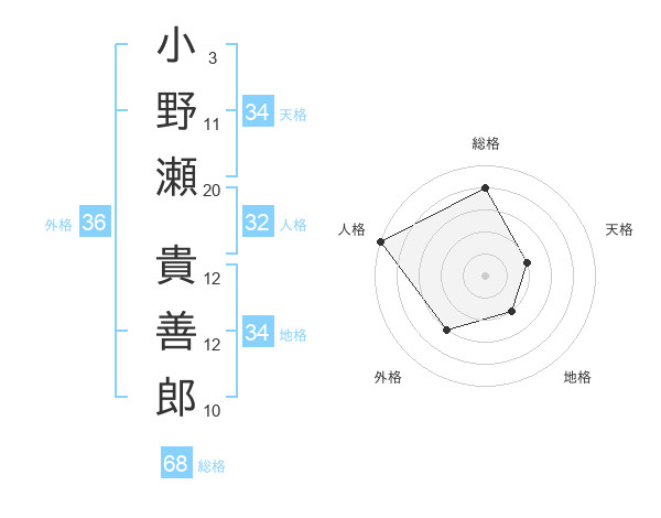 小野瀬 貴善郎さんの総格は68画の4点!
