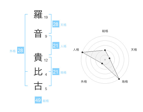 羅音 貴比古さんの地格は21画の5点!