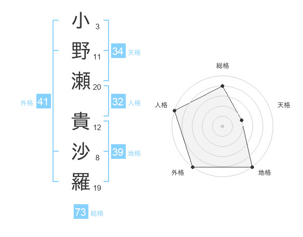 小野瀬 貴沙羅さんの総格は73画の4点!
