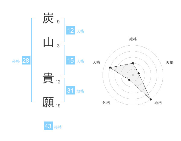 炭山 貴願さんの総格は43画の2点!