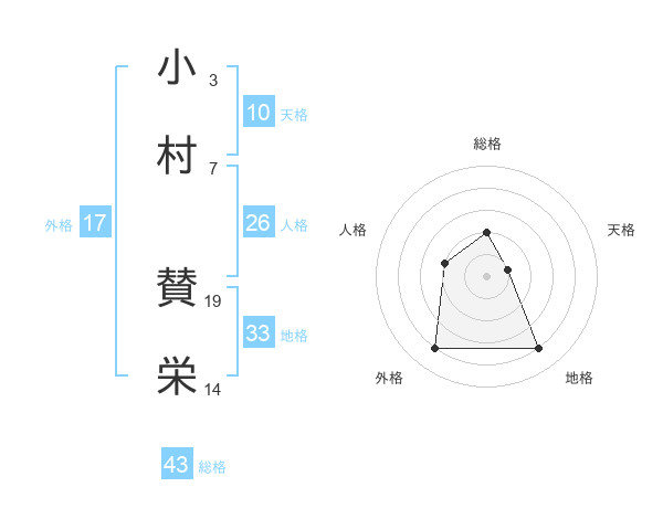 小村 賛栄さんの総格は43画の2点!