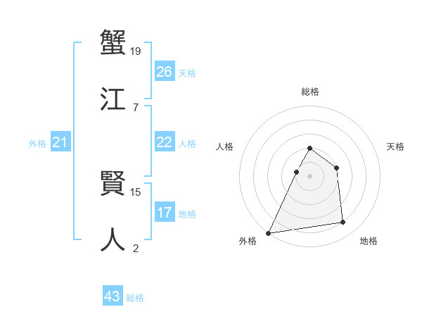 蟹江 賢人さんの総格は43画の2点!