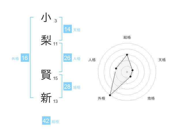 小梨 賢新さんを姓名の画数から五運を鑑定