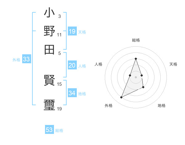 小野田 賢璽さんの総格は53画の3点!