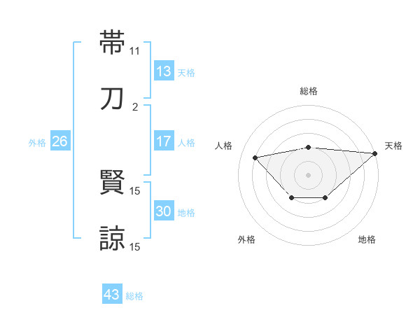 帯刀 賢諒さんの総格は43画の2点!