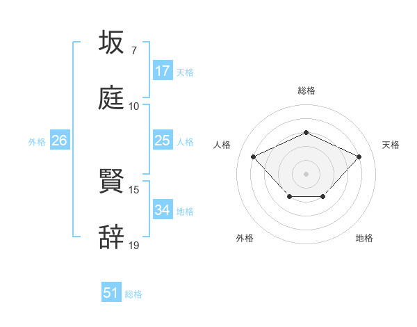 坂庭 賢辞さんの総格は51画の3点!
