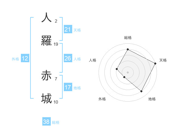 人羅 赤城さんの総格は38画の4点!