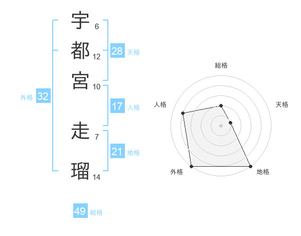 宇都宮 走瑠さんを姓名の画数から五運を鑑定