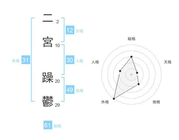 二宮 躁鬱さんの総格は61画の3点!