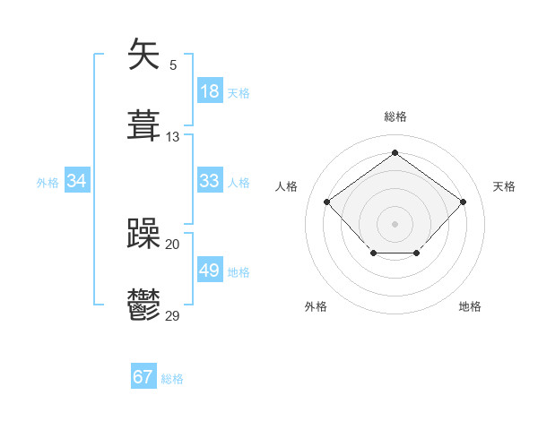 矢葺 躁鬱さんの総格は67画の4点!