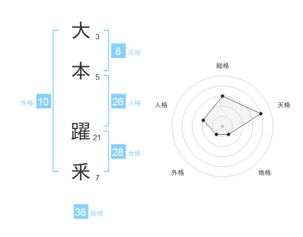大本 躍釆さんを姓名の画数から五運を鑑定