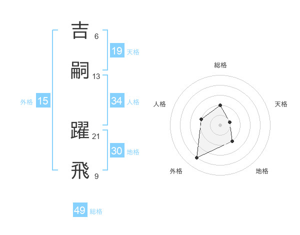 吉嗣 躍飛さんの総格は49画の2点!