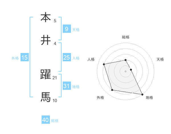 本井 躍馬さんを姓名の画数から五運を鑑定