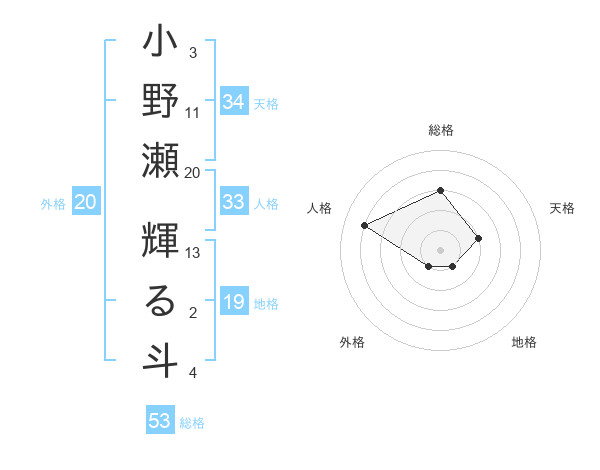 小野瀬 輝る斗さんの総格は53画の3点