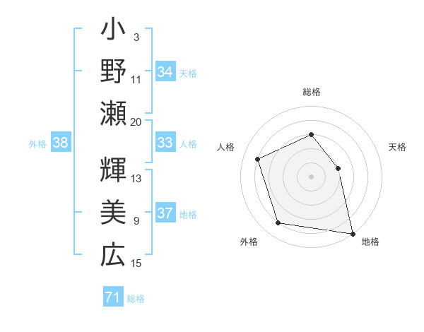 小野瀬 輝美広さんの総格は71画の3点