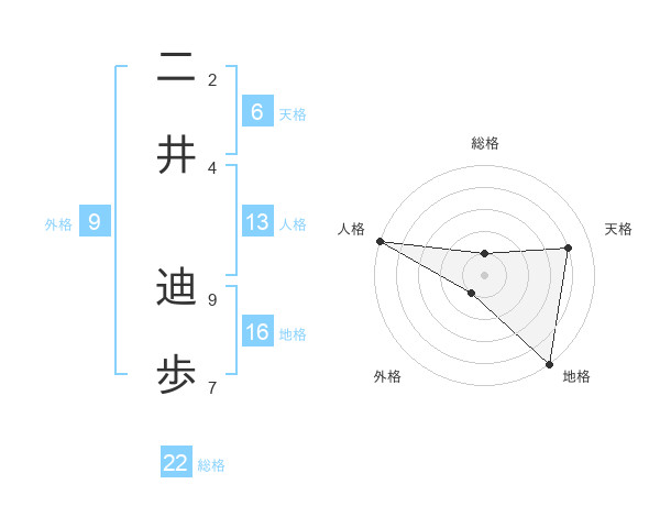 二井 迪歩さんの総格は22画の1点!