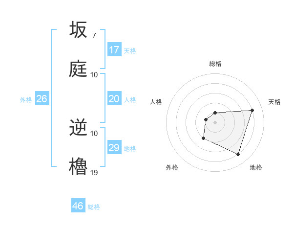 坂庭 逆櫓さんの総格は46画の1点!