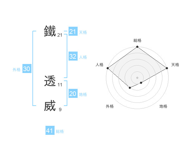 鐵 透威さんの総格は41画の5点!