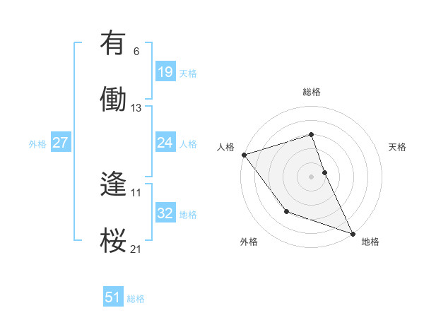 有働 逢桜さんを姓名の画数から五運を鑑定