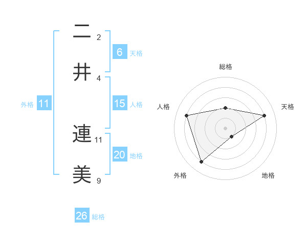 二井 連美さんの総格は26画の2点!
