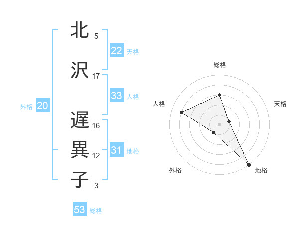 北沢 遅異子さんの総格は53画の3点!