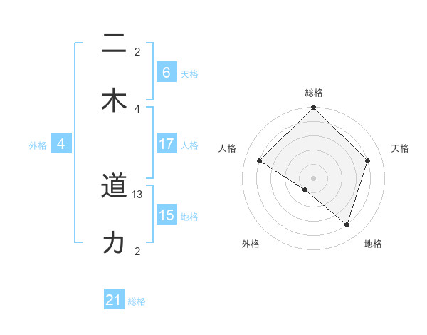 二木 道カさんの総格は21画の5点!
