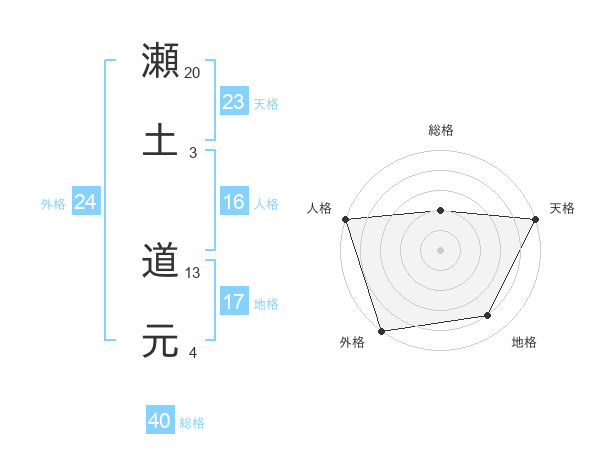 瀬土 道元さんの外格は24画の5点!