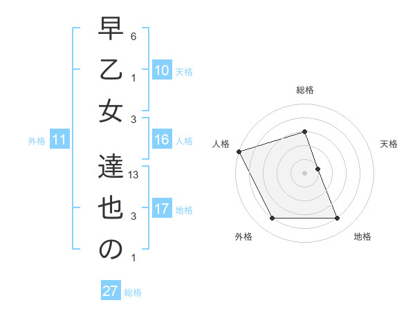 早乙女 達也のさんを姓名の画数から五運を鑑定