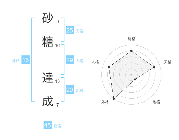 砂糖 達成さんの総格は45画の4点!